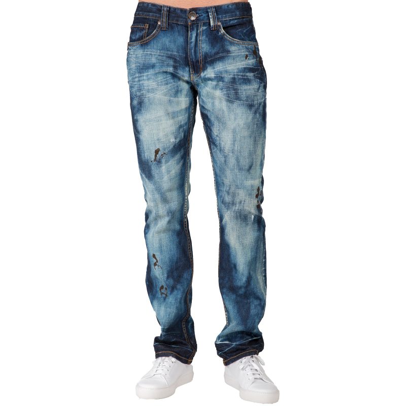 Slim Straight Dark Cloud Blue Premium Denim 5 Pocket Jeans Sanding Whisker Paint Splatter